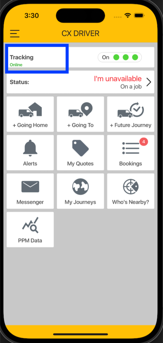 To switch vehicle tracking on, your driver will need to click the 'Tracking' button on their CX Driver app, as shown below.