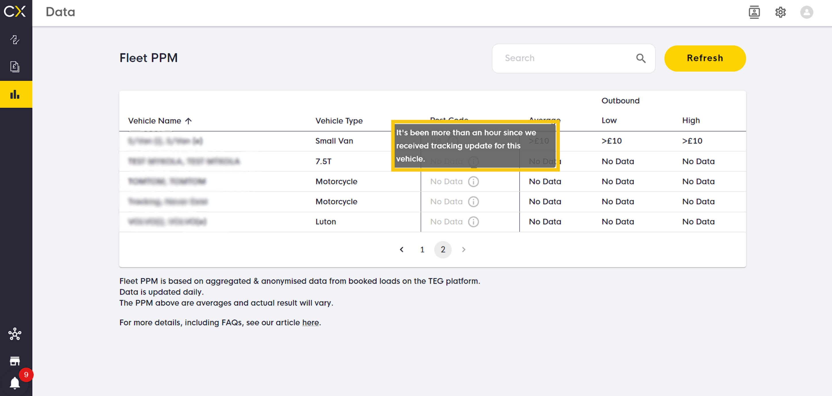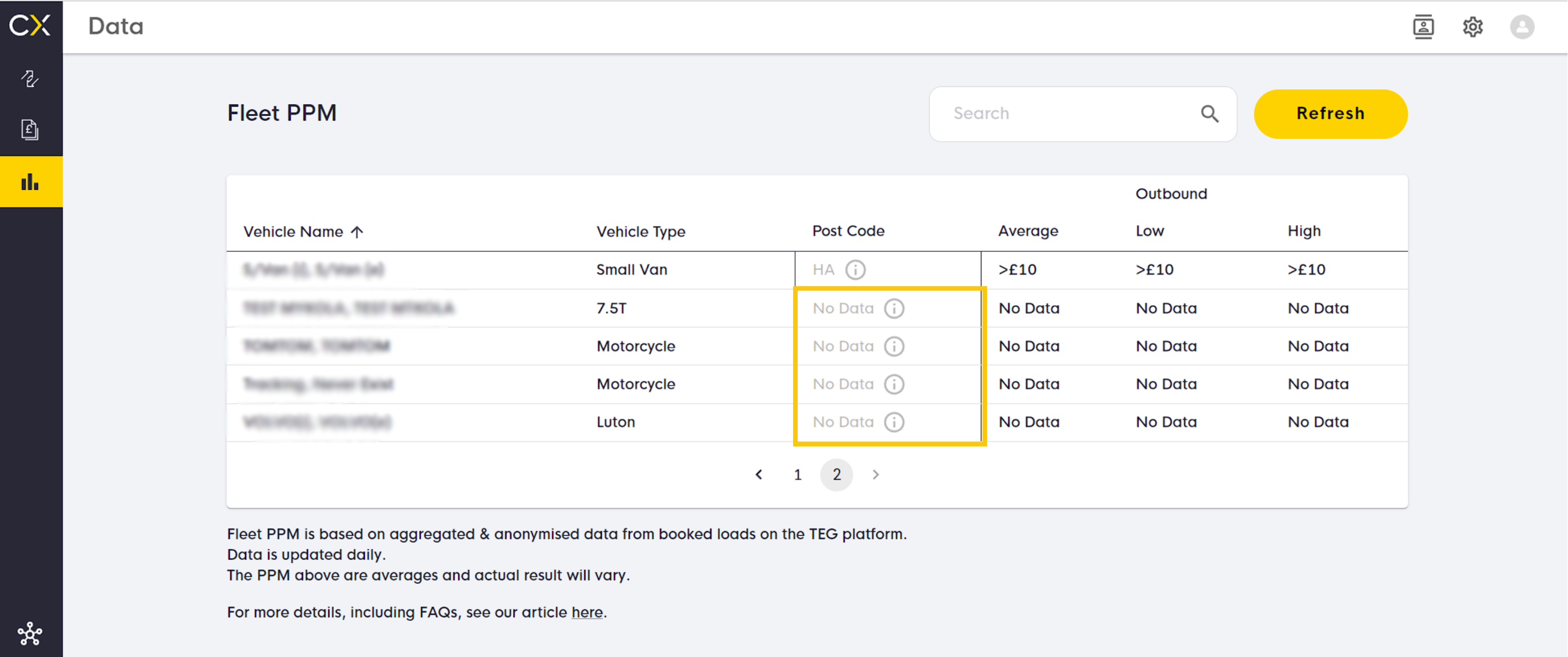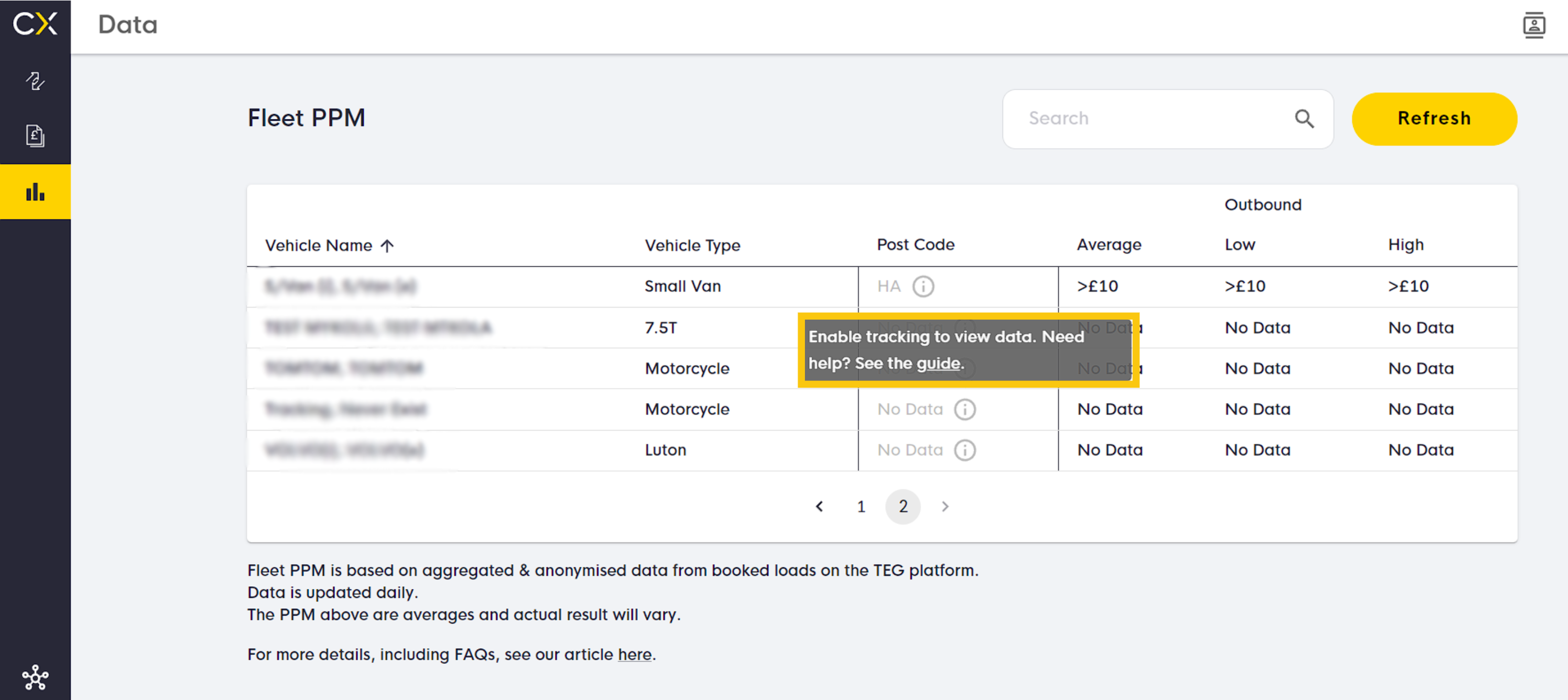 Fleet PPM is based on aggregated & anonymised data from booked loads on the TEG platform. Data is updated daily and based on a rolling 7-day average of prices-per-mile for the location your vehicles are currently in.
