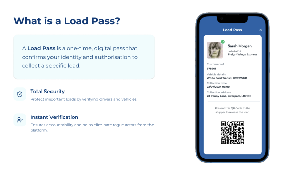 The Load Pass is a one time digital pass that is generated for a driver when they are allocated a SecureLoad. The Load Pass confirms the drivers identity and authorisation to collect the load.