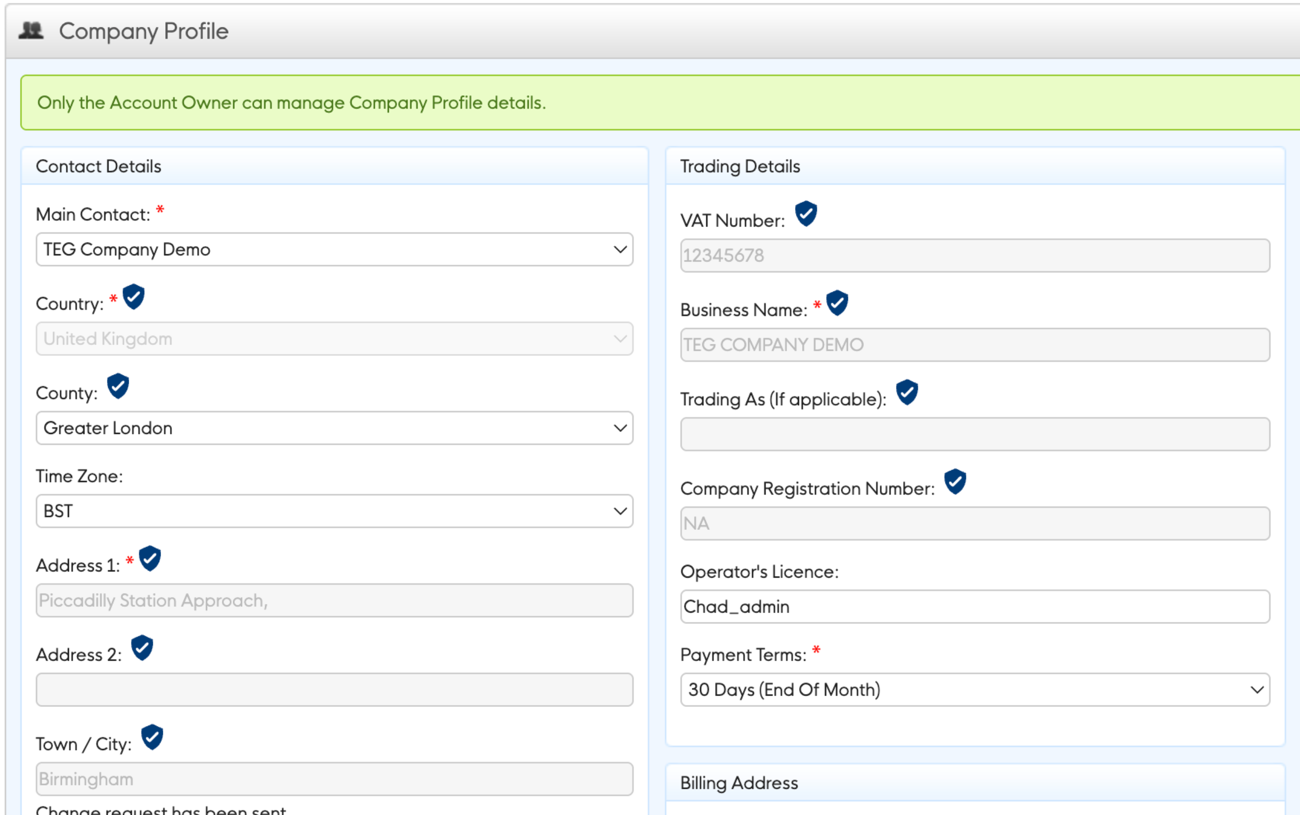 If your account is TEG compliant via Trustd, only the Account Owner can manage Company Profile details. Fields with a blue tick can only be edited via the Trustd profile.