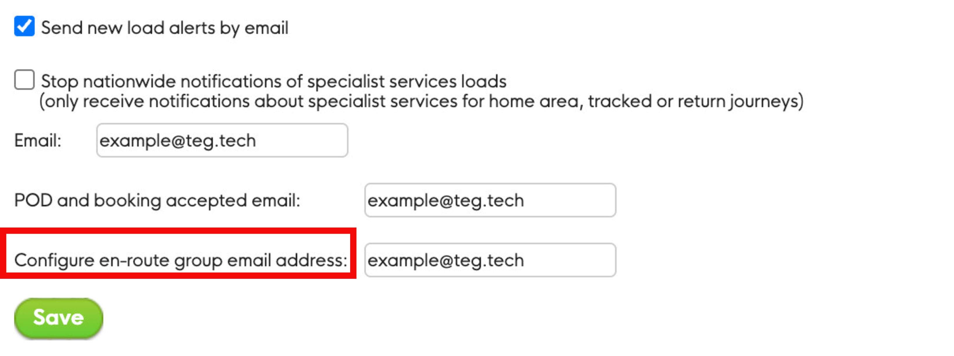 If you're a load poster, you can register more than one email address to receive en-route emails. You can also select a time frame as to when you would like to receive these email alerts (starting every 30 min to every 4 hours after the job has been allocated).